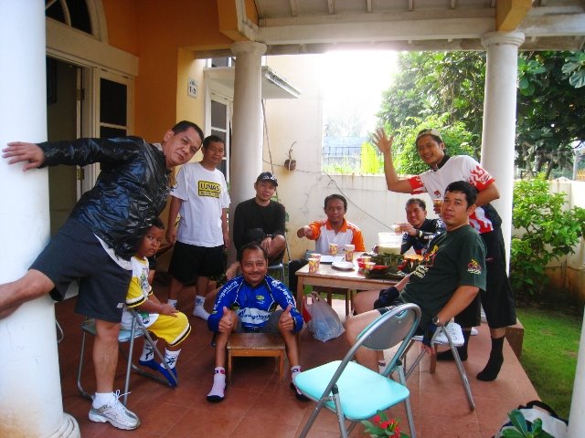 Om Gazelle [Lead Gitar Band Cimart] yang akhirnya muncul beberapa saat kemudian. Sebagai biker sejati, maka semua perlengkapan standard menempel di badan dan sepeda pak Lis [alias Om Gazelle]
