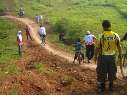 Setelah semua sepeda motor pengguna jalan umum ini dilewatkan, maka tibalah saat para pengendara sepeda untuk mencoba jalan menurun yang cukup terjal ini.