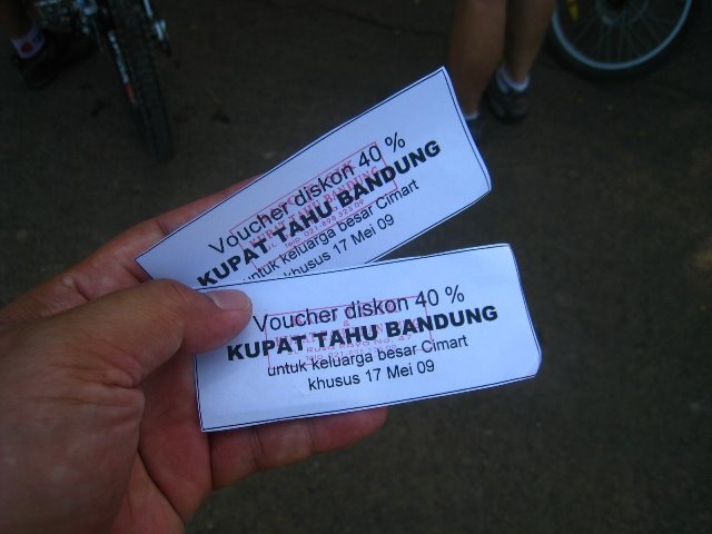 Begitu sampai di Golf Jababeka, LiLo langsung membagi voucher Kupat Tahu Bandung [KTB]. Ada diskon 40% dari pak Ato, anggota Grup Cimart yang menjadi pemilik KTB. Yang lucu adalah saat Lilo memberikan voucher diskon KTB ini ke Pak Ato, sang Pemilik KTB.