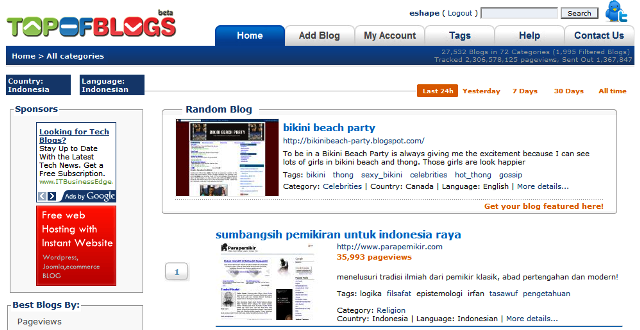 Iseng-iseng blogwalking, gak sengaja nemu situs Top Blogs. Banyak blog teman-teman yang bagus-bagus terpampang di situs itu. Meskipun ada juga satu dua blog yang bikin bulu kuduk merinding.