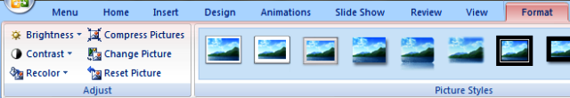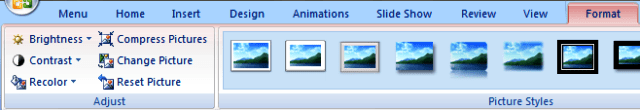 Mari kita coba buka sebuah file powerpoint dan kita klik kanan pada salah satu gambar yang tertempel pada file tersebut. Kita arahkan pointer ke menu FORMAT, maka akan terlihat tampilan menu sebagai berikut.