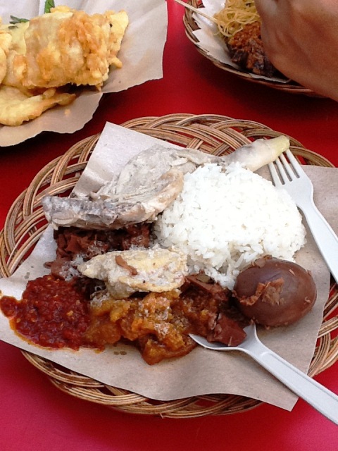 “Hmmm gudegnya enak, sesuai dengan harganya..”, jawabku.