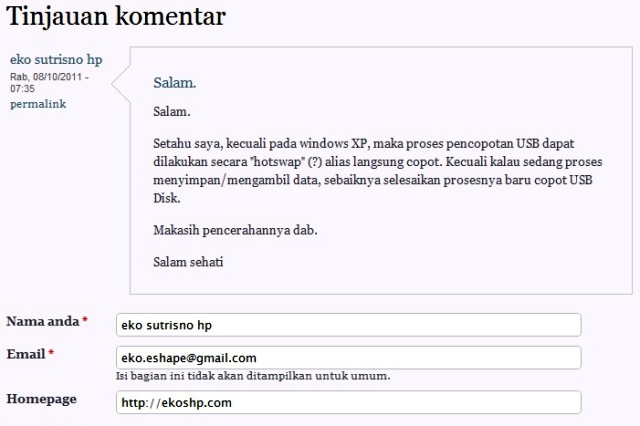 4. Contoh komentar yang sangat salah adalah : “Numpang jualan Gan, BB Onyx2 asli orisinil hanya 2 juta | Samsung Galaxy Ace original cukup hanya1,5 juta saja, hubungi 08xxxxxx…..” Nah, bisa dibayangkan betapa tersinggungnya pemilik blog. Bisa jadi komentar anda dihapus atau kalau tidak dihapus sebaiknya anda minta dihapus, karena akan memberikan citra kurang baik terhadap anda.