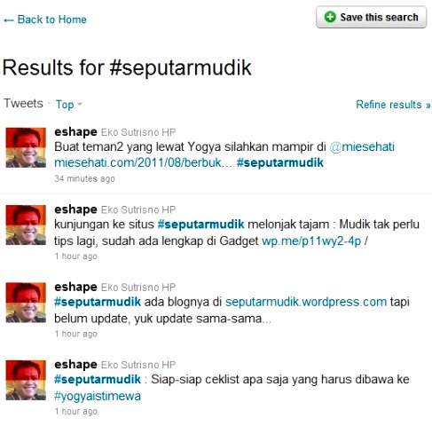 “Aku akan Live twit @eshape Seputar Mudik Jakarta Yogya, start Kamis jam 16.00”, begitu kataku pada teman-teman yang akan mudik maupun yang selalu jadi pemerhati para pemudik. Maksudnya agar yang ingin mengetahui kondisi lalu lintas mudik secara real time bisa follow aku di akun twitter @eshape.