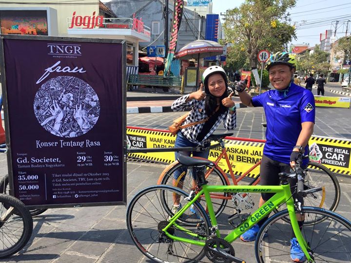 Selepas dari acara salah rute, aku memasuki rute jalan raya yang mulus dan akupun mengarahkan sepeda ke Car Free Day Jogja. Tulisan yang ada di spanduk cukup menarik, meskipun masih ada juga yang protes terhadap tulisan itu. Di Jakarta, seorang temanku pernah diskusi denganku tentang CFD Jakarta,”mas Eko, bukankah untuk menuju ke lokasi CFD, beberapa orang kulihat membawa mobil dan menggantungkan sepedanya di bagian belakang mobil, apakah itu maksudnya CFD ? Hanya sehari saja dalam sebulan atau seminggu dan tetap memanfaatkan kendaraan berBBM ?”