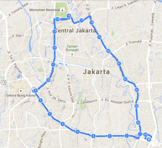 “Dari Hotel Teraskita Dafam kita menuju ke Semanggi, terus belok kanan menuju bunderan HI, lanjut bunderan patung kuda Monas, belok kanan ke proyek Gedung Perpustakaan Nasional, finish etape 1. Baliknya tinggal gowes melewati patung Tugu Tani, Senen, Kampung Melayu sampai ke hotel Teraskita Dafam dan lanjut sarapan”
