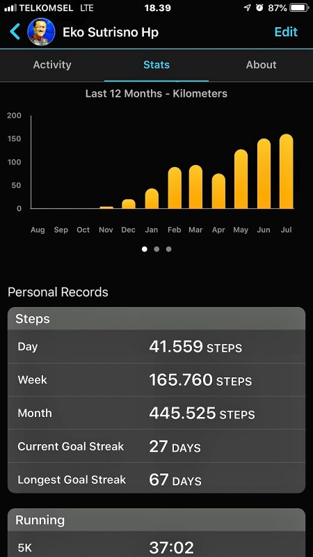Perjalan berlariku masih baru dimulai dan masih buth waktu untuk lebih memaknai jiwa dalam olah raga lari/jalan. Baru hampir setahun aku mulai menekuni olah raga ini dan kegiatanku berklari jadi mengurangi kegiatanku bersepeda, tetapi sebenarnya bukan mengurangi tapi membuat kegiatanku berolah raga makin lengkap, kita tahu bahwa oleh raga lari (jalan), renang dan bersepeda akan memakai otot yang berbeda dan membuta kita lengkap melatih otot kita. Inilah yang membuatku merasa hari Kamis optimis ini akan memulai hidup yang lebih hidup.