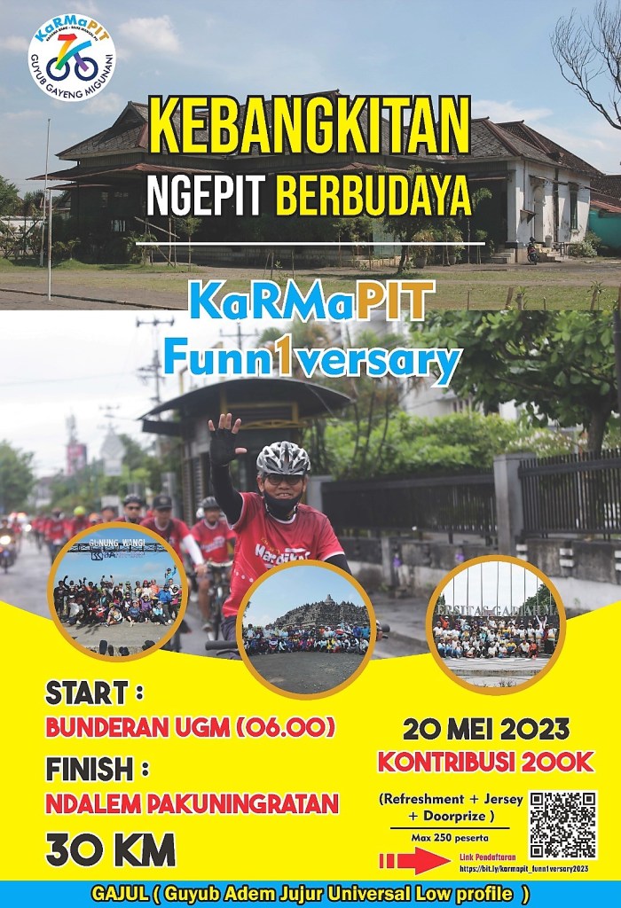 Dalam rangka harlah pertama KaRMaPIT, memang beberapa kegiatan telah disusun, antara lain tumpengan dan tentu saja puncak acaranya ngepit bersama (ngeBAR), sejauh 30 K, mulai dari kampus UGM sampai nDalem Pakuningratan, sehingga lokasi start dan finish berdekatan saja, masih tetap di dalam kota, sehingga panitiya maupun peserta ngeBAR dapat menikmati acara dengan lebih nyaman.